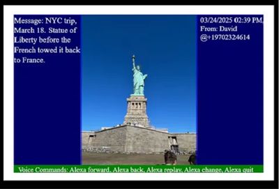 The initial design is intended for people living in residential care, assisted living, memory care and skilled nursing environments, as well as those living independently at their own homes, to be included in the communications with friends and family. My Connections is a “voice only skill” for the end user and does not require or allow screen interaction. While My Connections does require a voice to speak a command to activate, it can be the user’s voice or that of a friend or caregiver. The simplest command to start the skill is ‘Alexa, My Connections’. This command starts the presentation in reverse chronological order showing the most recent messages and attached photos or videos first in a continuous timed loop. The message portion of the text message is converted to speech and played during the presentation of the photo and message.